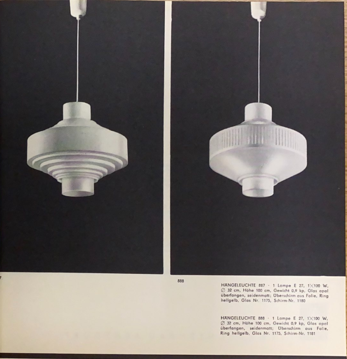 Diese Leuchte wurde vom VEB Leuchtenbau Arnsdorf in Sachsen produziert. Das Glas ist opal überfangen und seidenmatt, während der Überschirm aus Folie besteht. Der Ring ist hellgelb. Verbaut wird ein E 27 Leuchtmittel. Die Leuchte hat einen Durchmesser von 32 cm und eine Höhe von 100 cm. Der Lampenschirm hat die Kennungsnummer 1180. Zu finden im Katalog „Katalog VEB Leuchtenbau Arnsdorf 1964“ von IKA Electrica.