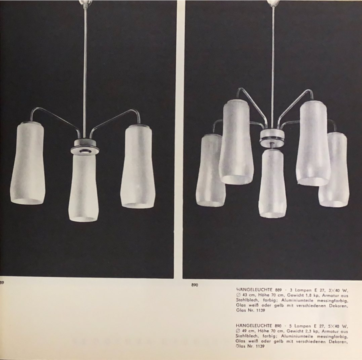 Diese Leuchte wurde vom VEB Leuchtenbau Arnsdorf in Sachsen produziert. Es existieren zwei Varianten: die 889 mit drei Lampen und die 890 mit fünf Lampen. Anderweitig sind keine weiteren Unterschiede zwischen den vier Typen dokumentiert. Einer der Lampenschirme wird bei der 890 am mittleren Körper montiert. Pro Lampenschirm wird eine E 27 Glühbirne montiert. Die Lampenschirme selbst bestehen aus weißen Glas mit verschiedenen Dekoren. Die Armatur ist aus farbigen Stahlblech und die Aluminiumteile sind messingfarbig. Der Lampenschirm hat die Kennungsnummer 1139. Die kleine 889 hat einen Durchmesser von 43 cm und die 890 von 49 cm. Zu finden im Katalog „Katalog VEB Leuchtenbau Arnsdorf 1964“ von IKA Electrica.