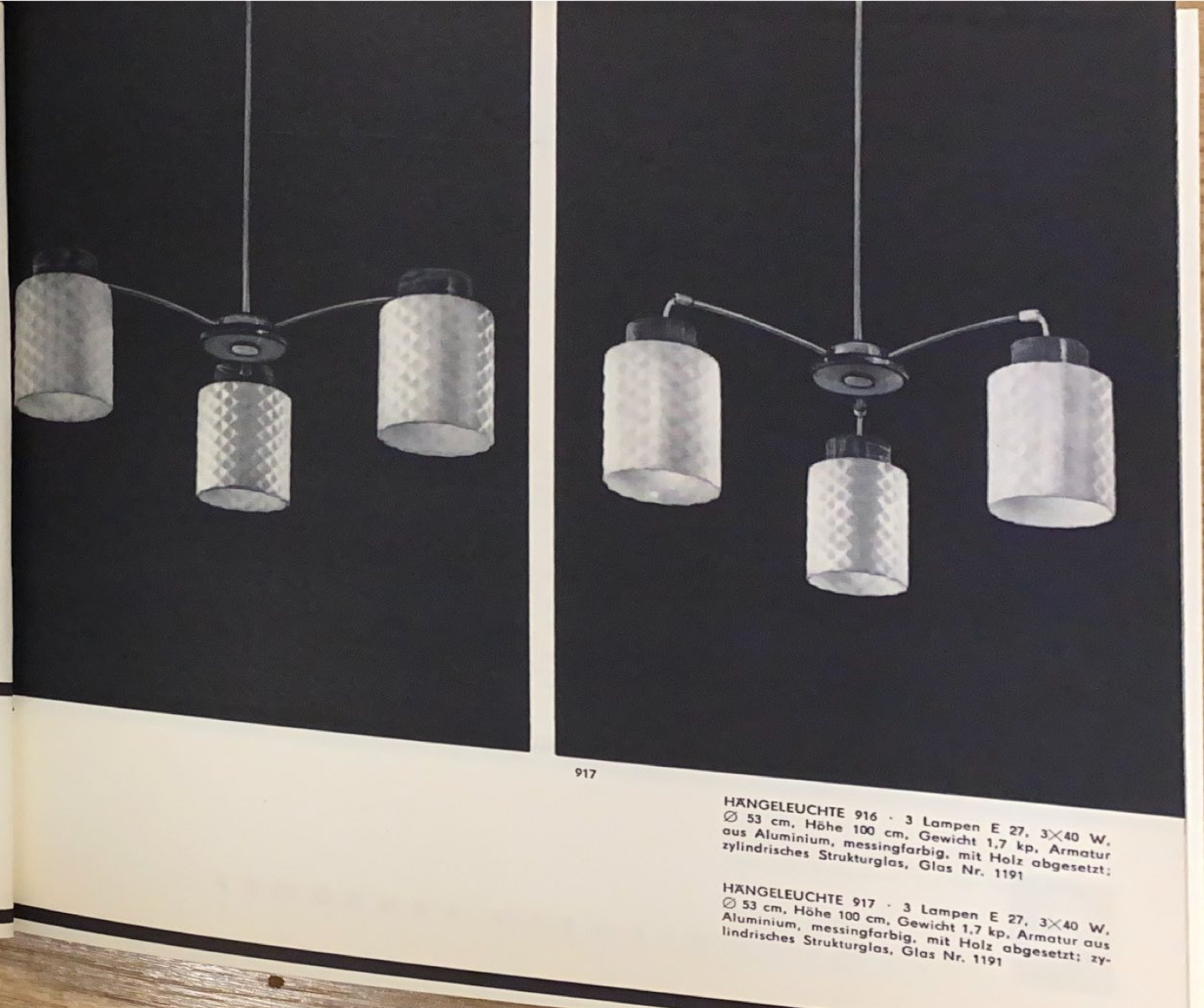 Diese Leuchte wurde vom VEB Leuchtenbau Arnsdorf in Sachsen produziert. Es existieren zwei Varianten: die 916 mit drei Lampen und seitlich steckenden Armen und die 917 mit drei Lampen und obig steckenden Armen. Anderweitig sind keine weiteren Unterschiede zwischen den vier Typen dokumentiert. Pro Lampenschirm wird eine E 27 Glühbirne montiert. Die Lampenschirme selbst bestehen aus zylindrischen Strukturglas. Die Armatur ist aus Aluminium und messingfarbig, zugleich mit Holz abgesetzt. Der Lampenschirm hat die Kennungsnummer 1191. Es können auch die oben mittig gezeigten Gläser verbaut sein. Beide haben einen Durchmesser von 53 cm. Zu finden im Katalog „Katalog VEB Leuchtenbau Arnsdorf 1964“ von IKA Electrica.