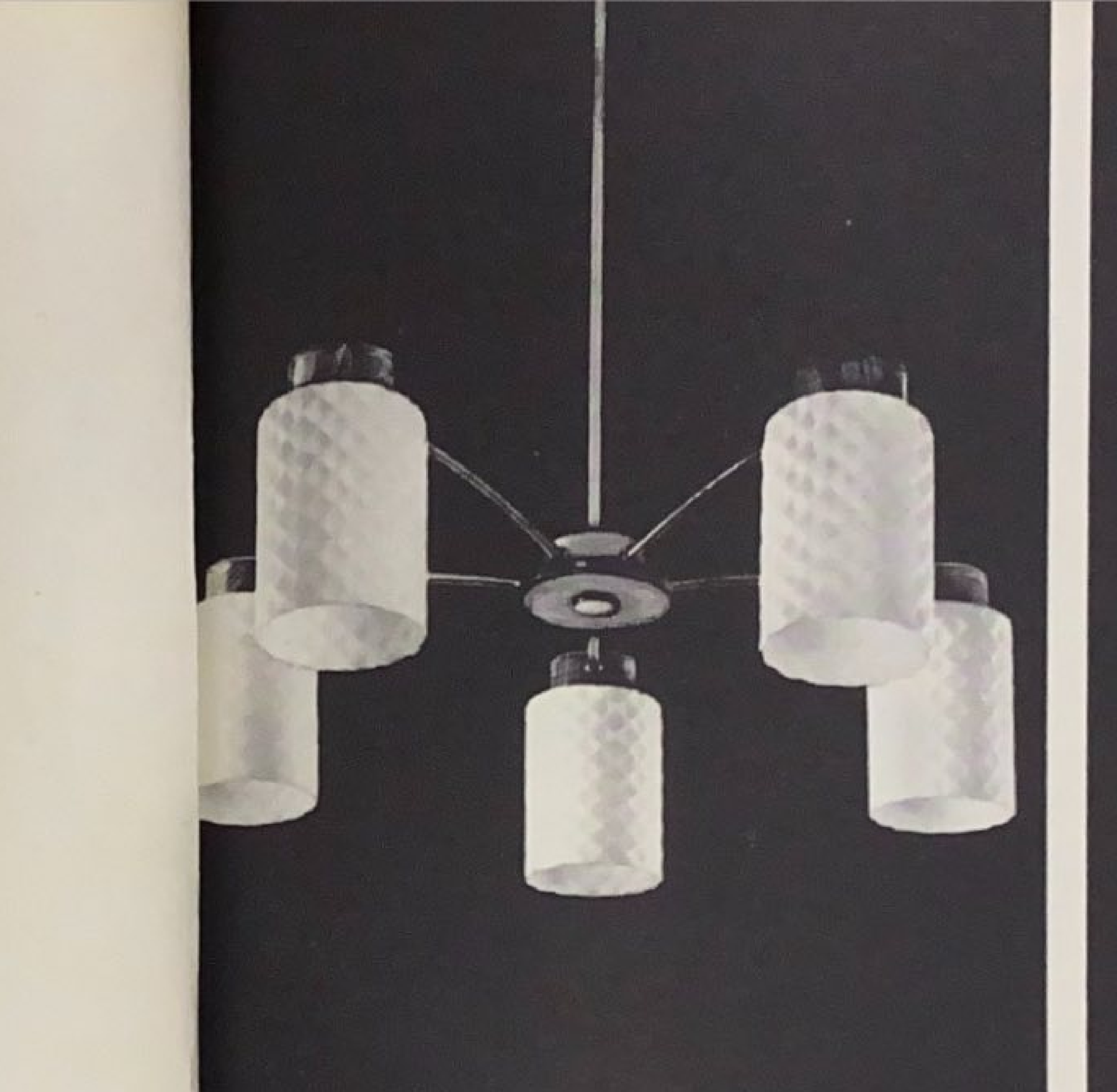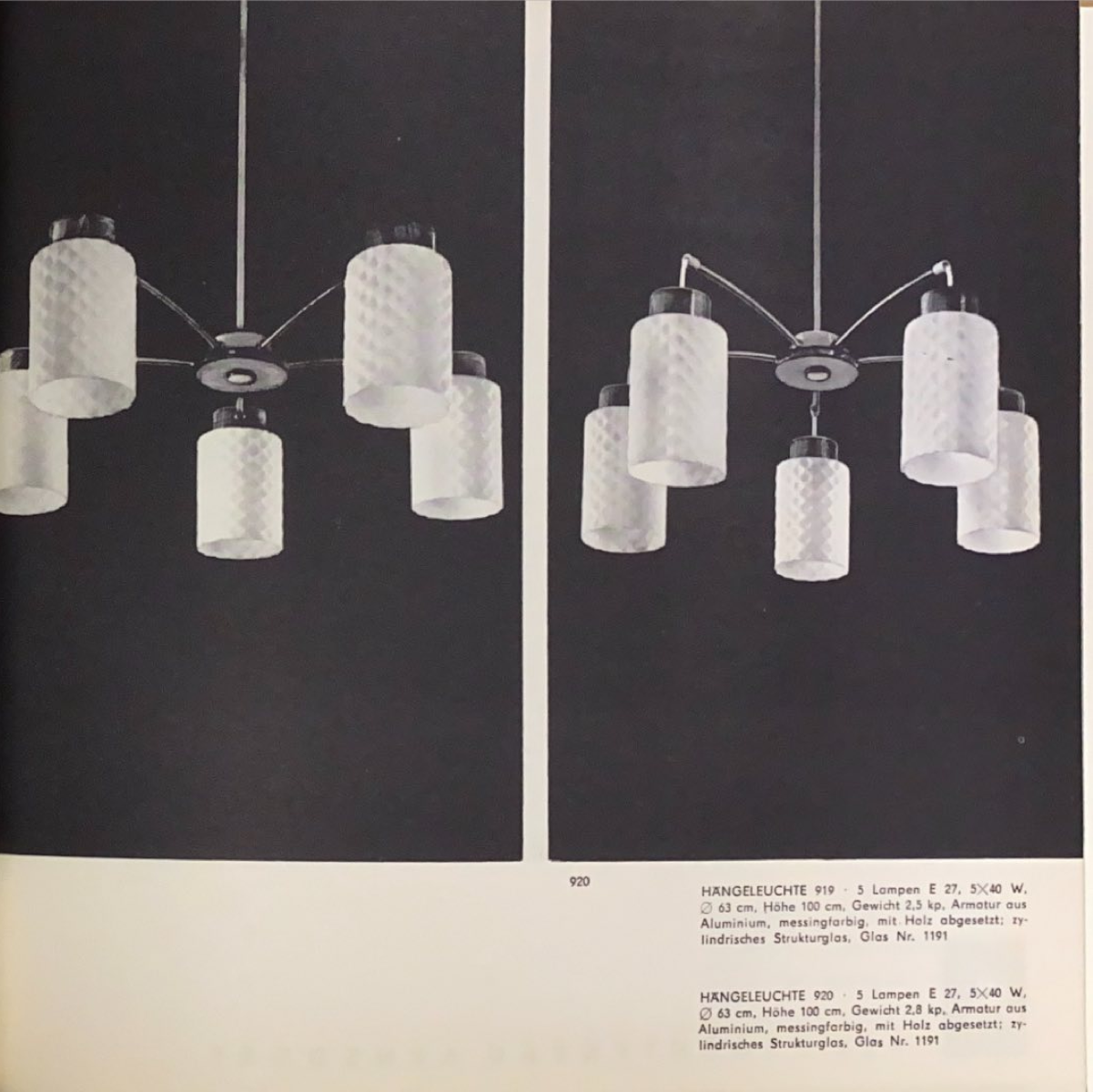 Diese Leuchte wurde vom VEB Leuchtenbau Arnsdorf in Sachsen produziert. Es existieren zwei Varianten: die 919 mit drei Lampen und seitlich steckenden Armen und die 920 mit drei Lampen und obig steckenden Armen. Anderweitig sind keine weiteren Unterschiede zwischen den vier Typen dokumentiert. Pro Lampenschirm wird eine E 27 Glühbirne montiert. Die Lampenschirme selbst bestehen aus zylindrischen Strukturglas. Die Armatur ist aus Aluminium und messingfarbig, zugleich mit Holz abgesetzt. Der Lampenschirm hat die Kennungsnummer 1191. Es können auch die oben mittig gezeigten Gläser verbaut sein. Beide haben einen Durchmesser von 53 cm. Zu finden im Katalog „Katalog VEB Leuchtenbau Arnsdorf 1964“ von IKA Electrica.
